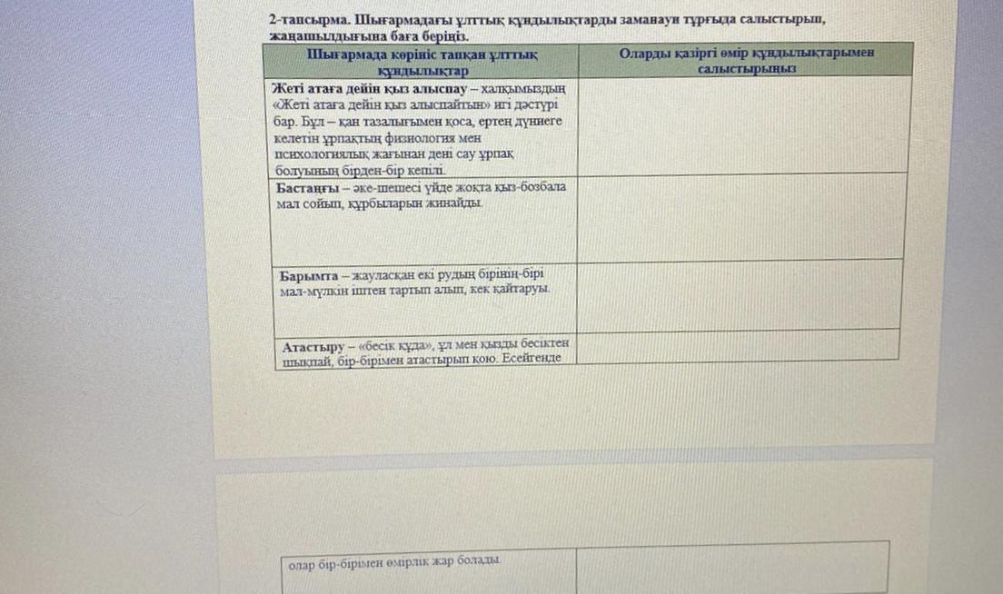 2-тапсырма. Шығармадағы ұлттық құндылықтарды заманауи тұрғыда салыстырып,