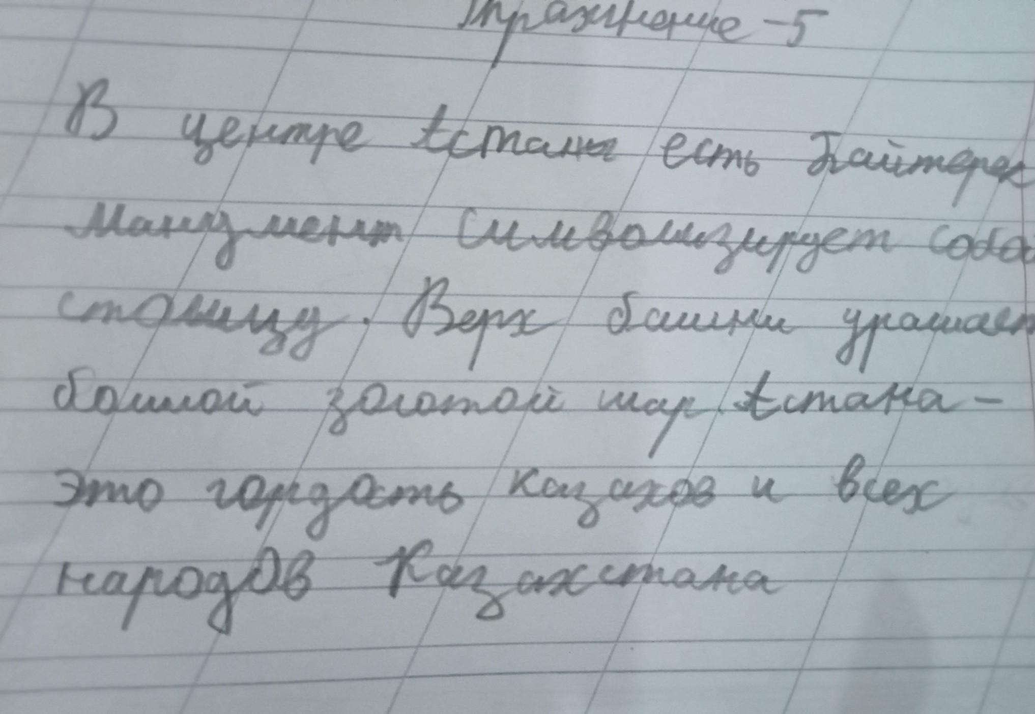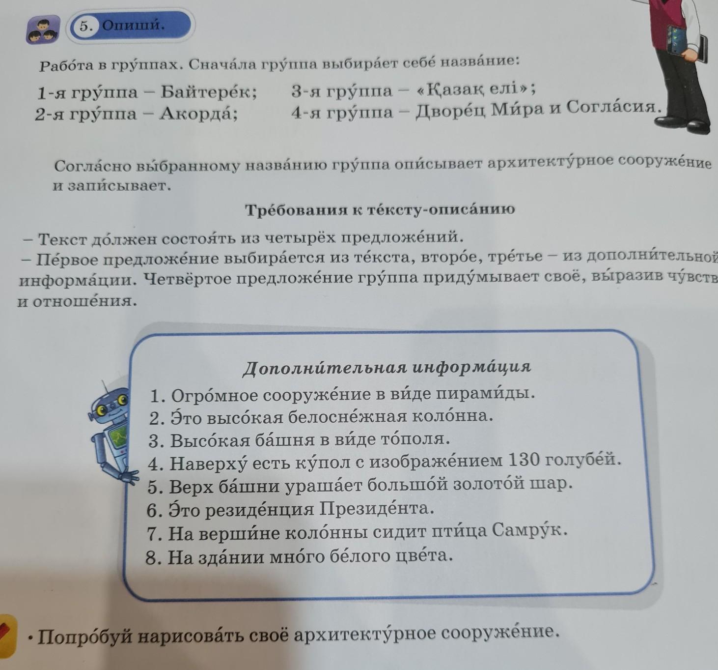 5. Опиши. Работа в группах. Сначала группа выбирает себé название: 1-я группа - Байтерек; - 2-я группа - Акорда; 3-я группа - «Қазақ елі»; 4-я группа – Дворец Мира и Согласия. Согласно выбранному названию группа описывает архитектурное сооружение и записывает. Требования к тéксту-описанию Текст должен состоять из четырёх предложений. Первое предложение выбирается из текста, вторѓе, третье - из дополнительной информации. Четвёртое предложение группа придумывает своё, выразив чувства и отношения. Дополнительная информация 1. Огромное сооружение в виде пирамиды. 2. Это высокая белоснежная колóнна. 3. Высокая башня в виде тополя. 4. Наверхý есть купол с изображением 130 голубей. 5. Верх башни урашает большой золотой шар. 6. Это резиденция Президента. 7. На вершине колонны сидит птица Самрук. 8. На здании много бéлого цвета. . Попробуй нарисовать своё архитектурное сооружение.