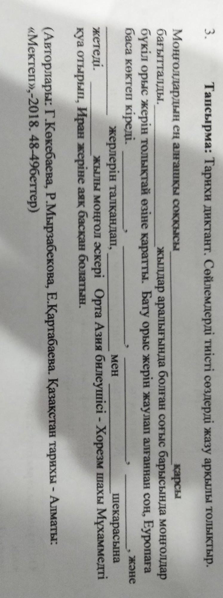 3. Тапсырма: Тарихи диктант. Сөйлемдердi тиiстi сөздердi жазу аркылы толыктыр. Монголдардын ен алгашкы соккысы багытталды. карсы жылдар аралығында болған согыс барысында монғолдар бүкіл орыс жерiн толықтай өзiне каратты. Бату орыс жерін жаулап алғаннан соң, Еуропаға баса көктеп кіреді. жерлерін талқандап, мен шекарасына жылы монгол эскерi Орта Азия билеушiсi - Хорезм шахы Мұхаммедті жетеді. куа отырып, Иран жерiне аяк баскан болатын. СРОЧНО 6 КЛАСС