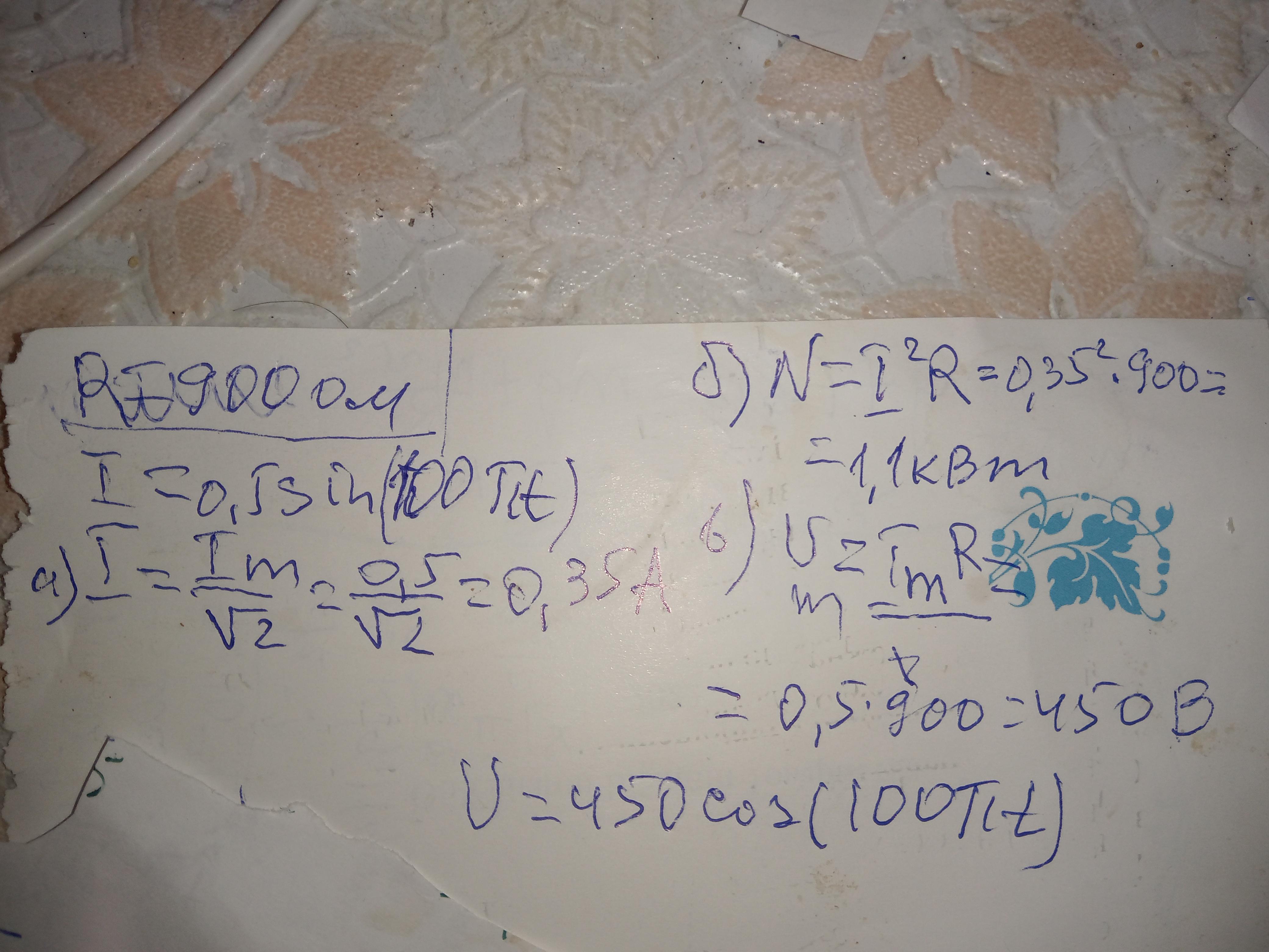 На ділянці кола з активним опором 900 Ом сила струму змінюється за зако- ном i = 0,5 sin 100 nt (A). Визначте: а) діючі значення сили струму й напруги; б) потужність, яка виділяється на ділянці; в) напругу, на яку має бути розрахована ізоляція проводів. Запишіть рівняння залежності u(t).