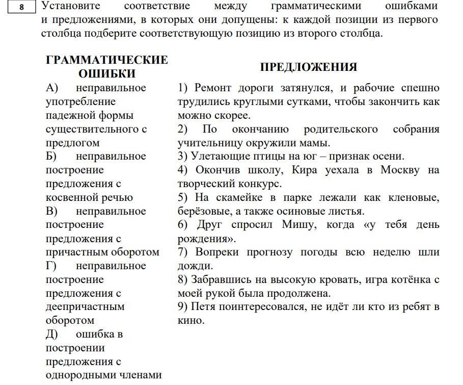 Установите соответствие между грамматическими ошибками и предложениями, в которых они допущены: