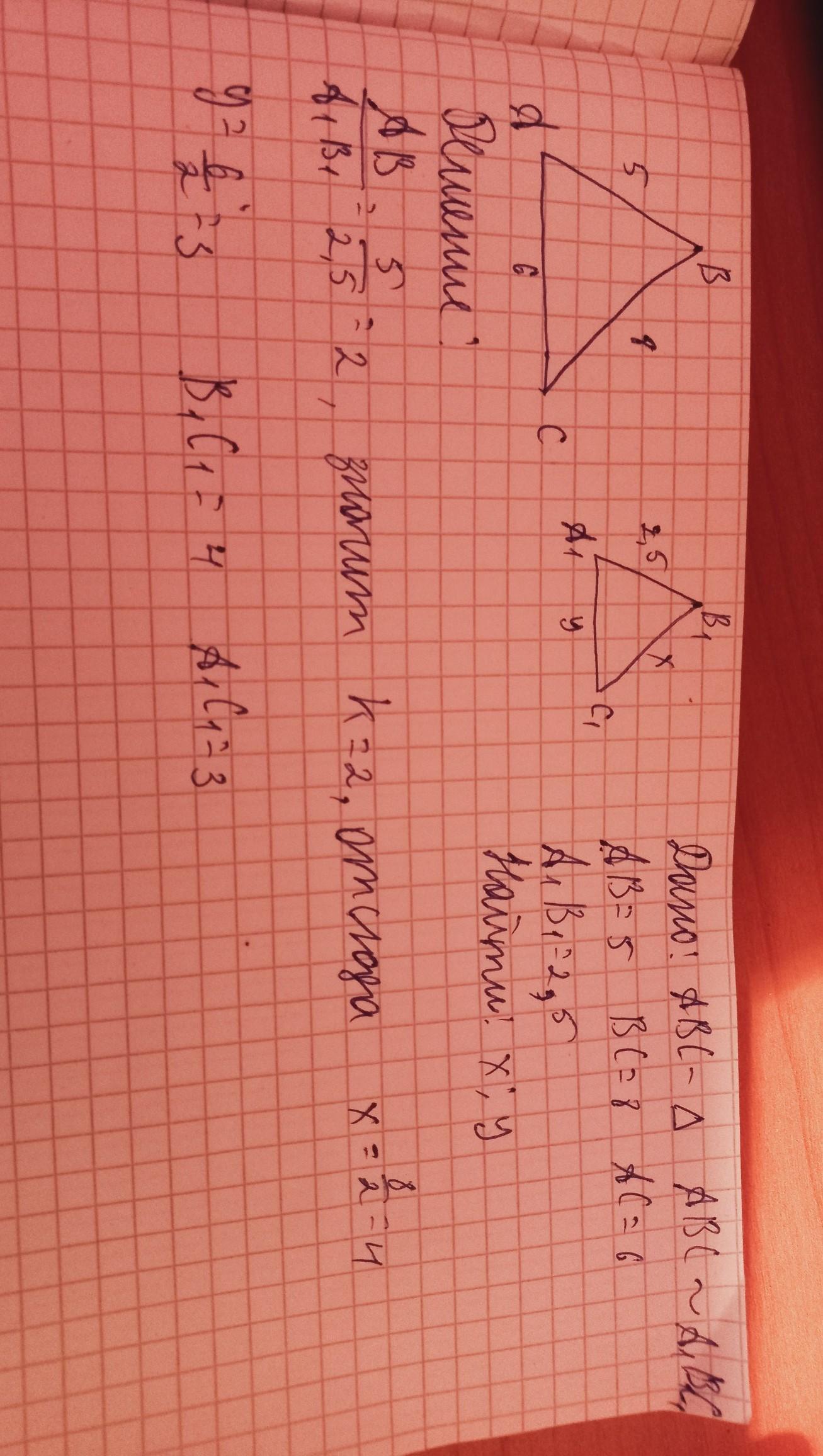 11. Стороны одного треугольника равны 8 см, 6 см и 5 см. Меньшая сторона второго треугольника, подобного первому, равна 2,5 см. Найдите другие стороны второго треугольника.