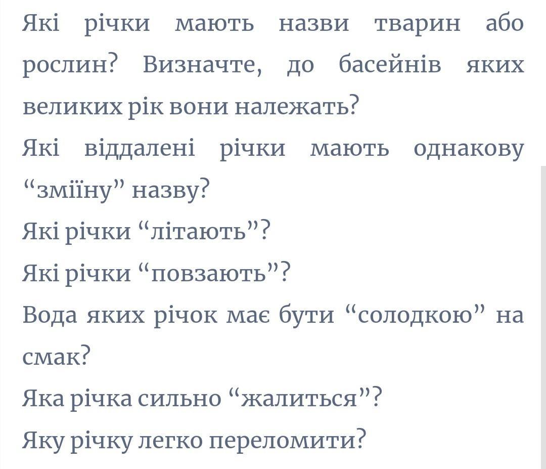 Які річки мають назви тварин або рослин? Визначте, до басейнів яких великих рік вони належать? Які віддалені річки мають однакову "зміїну" назву? Які річки "літають"? Які річки "повзають”? Вода яких річок має бути “солодкою” на смак? Яка річка сильно “жалиться"? Яку річку легко переломити?