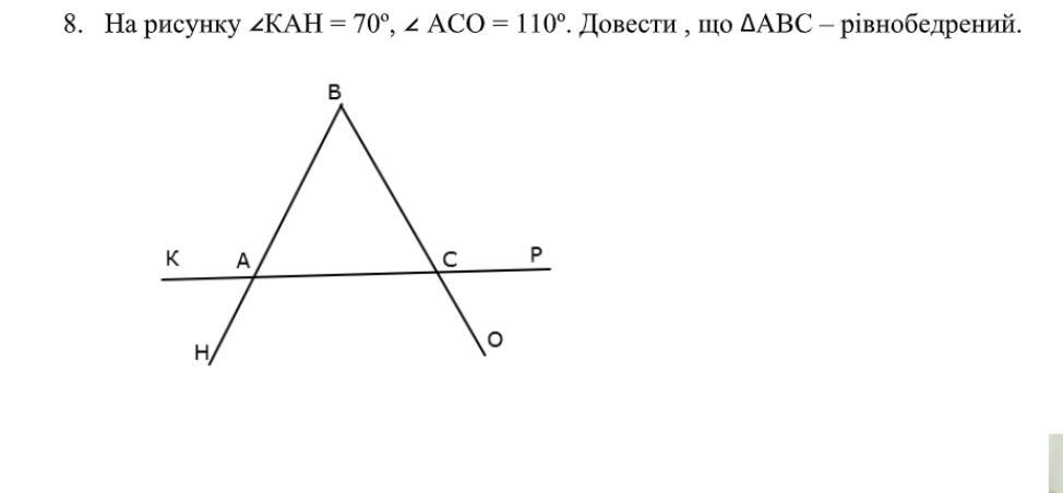 кутBAC при основі дорівнює куту KAH-кути вертикальні,другий при основі BCA=180-ACO=180-110=70см-кути суміжні.Два кути однакові тому трикутник рівнобедрений