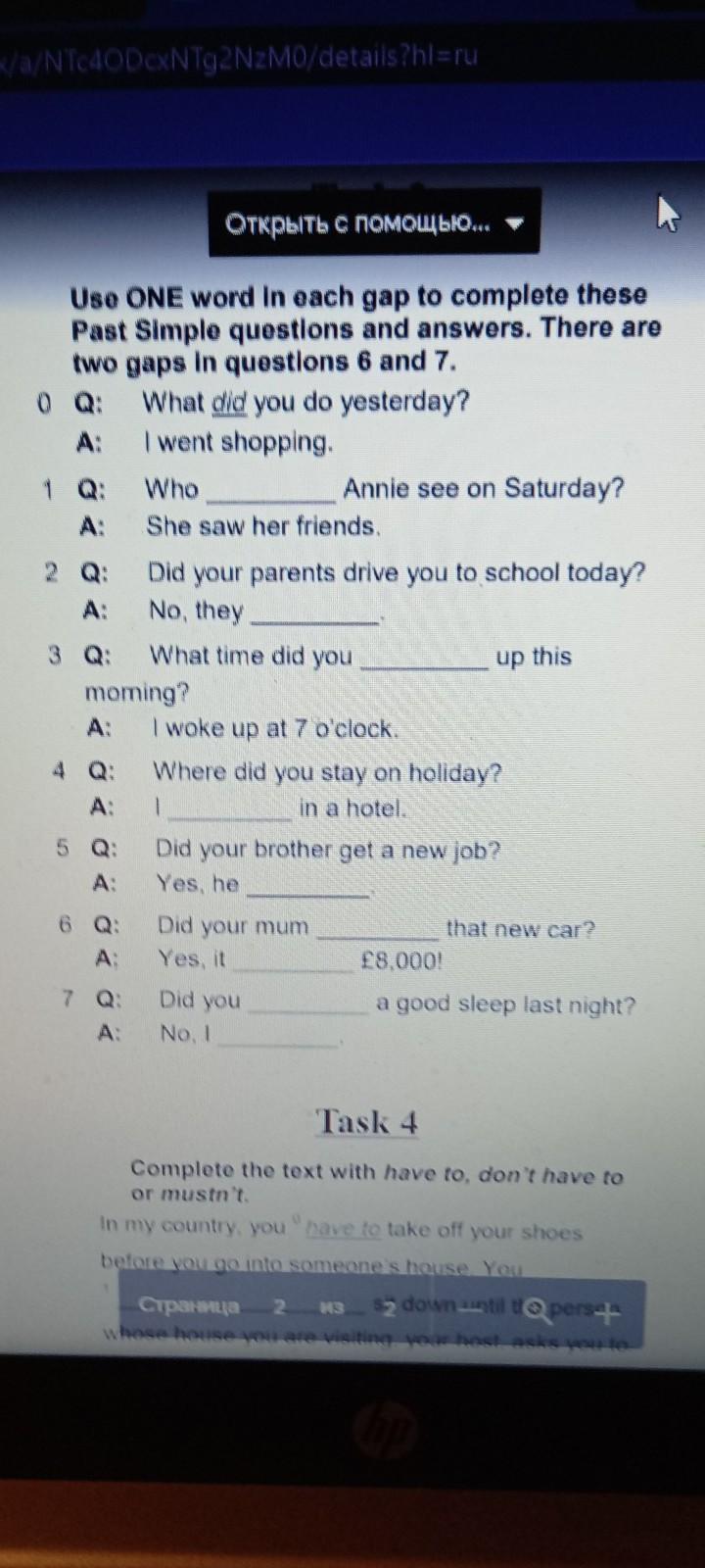 !ПОМОГИТЕ ДАЮ 40 БАЛЛОВ СРОЧНО!Use ONE word in each gap to complete these Past Simple questions and answers. There are two gaps in questions 6 and 7. What did you do yesterday? 0 Q: A: I went shopping. 1 Q: A: 2 Q: A: 3 Q: A: 4 Q: A: 5 Q: A: moming? 6 Q: A: 7 Q: A: Who She saw her friends. Did your parents drive you to school today? No, they What time did you Annie see on Saturday? I woke up at 7 o'clock. Where did you stay on holiday? in a hotel. Did your mum Yes, it up this 1 Did your brother get a new job? Yes, he Did you No. I that new car? £8,000! a good sleep last night?