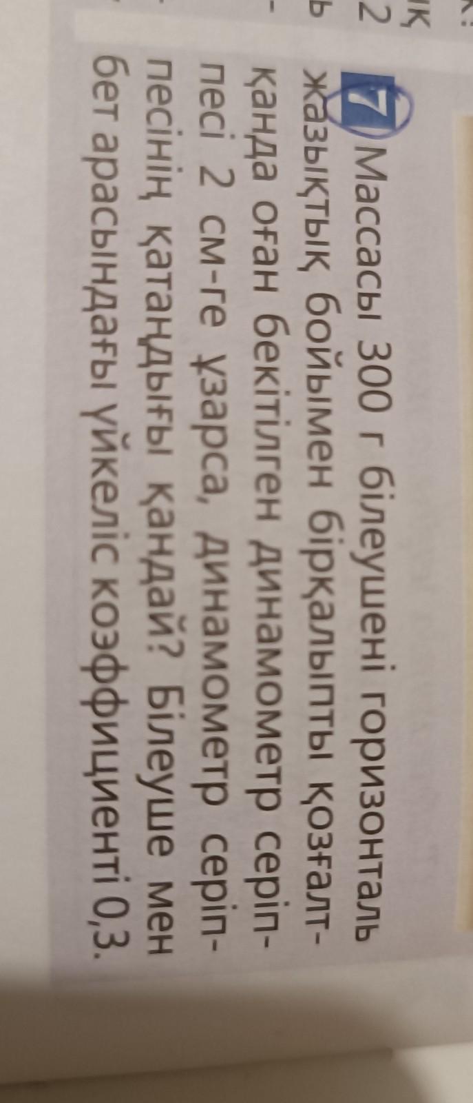 Массасы 300 г білеушені горизонталь жазықтық бойымен бірқалыпты қозғалт- қанда оған бекітілген динамометр серіп- песі 2 см-ге ұзарса, динамометр серіп- песінің қатандығы қандай? Білеуше мен Бет арасындағы үйкеліс коэффициенті 0,3.