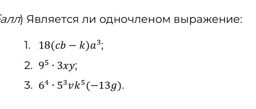 1. 18(cb-k)a³ это не одночлен, тк если мы откроем скобки, получится вот что 18cba³-18ka³ (Тут есть знак между переменными, а это нас не устраивает).