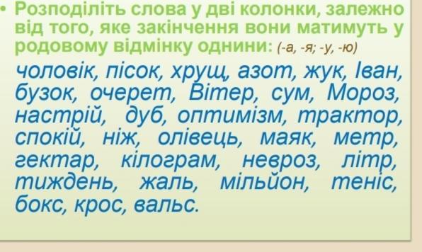 2.пісок,азоти, бузок, очерет, вітер, сум, мороз,настрій, дуб, оптимізм, трактор, спокій, маяк, метр, гектар, кілограм, невроз, літр, тиждень, жаль,мільйон, теніс, бокс, крост вальс