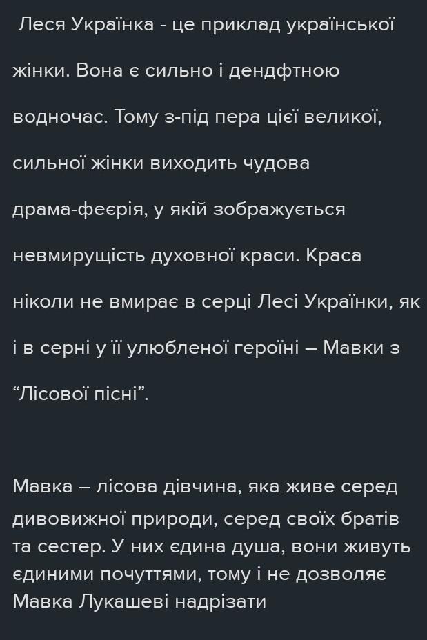 Леся Українка - це приклад української жінки. Вона є сильно і дендфтною водночас. Тому з-під пера цієї великої, сильної жінки виходить чудова драма-феєрія, у якій зображується невмирущість духовної краси. Краса ніколи не вмирає в серці Лесі Українки, як і в серні у її улюбленої героїні – Мавки з “Лісової пісні”.