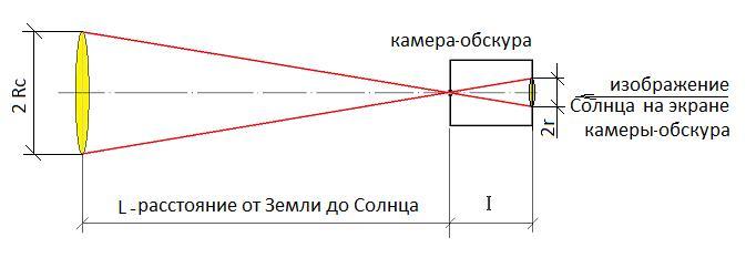 Ответ: Не стоит паниковать Работа сравнительно простая. Смотрите рисунок. Камера-обскура это просто закрытый ящик с небольшим отверстием в передней стенке, и с матовым экраном на задней стенке. Через отверстие проходят солнечные лучи и строят изображение Солнца на экране камеры. Изображение будет не очень резким, так как отверстие в камере имеет некоторый, не бесконечно малый, диаметр. Тем не менее, можно измерить диаметр этого изображения Солнца. Чем больше длина (I) камеры тем больший диаметр будет иметь изображение Солнца. Следует сказать сразу, что диаметр этот будет не очень большим. Так, например, при длине камеры 1 метр, диаметр изображения Солнца будет немного меньше 9 миллиметров. На рисунке изображен ход лучей от Солнца до экрана камеры. Так как в данном случае солнечные лучи распространяются прямолинейно, то получились два подобных равнобедренных треугольника. Боковые стороны треугольников – красные лучи. Из подобия треугольником можно записать, что 2r/I = 2Rc/L. На рисунке 2Rc – это диаметр Солнца. Из приведенного соотношения 2Rc = 2r* L/ I. Как видите делить на 2 измеренный диаметр изображения Солнца совершенно не обязательно, так как в формулу входит именно диаметр изображения Солнца. Таким образом, чтобы вычислить (найти) диаметр Солнца надо диаметр изображения Солнца умножить на расстояние от Земли до Солнца равное 149600000000 метра, а затем полученную величину разделить на длину камеры-обскуры, выраженную в метрах.