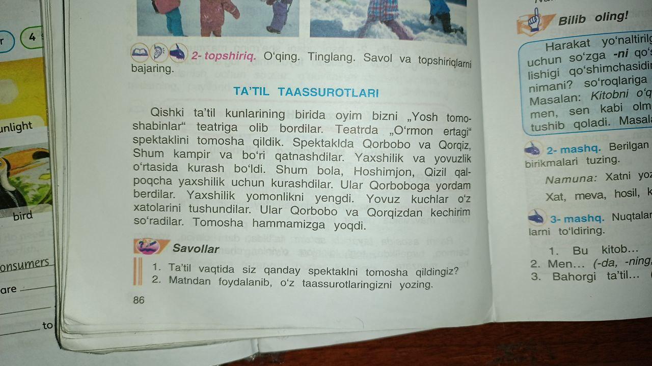 1 ta'til vaqtida men oila a'zolarim bilan qo'g'irchoq spektakliga bordik. U yerda Oltin baliq spektaklini tomosha qildik
