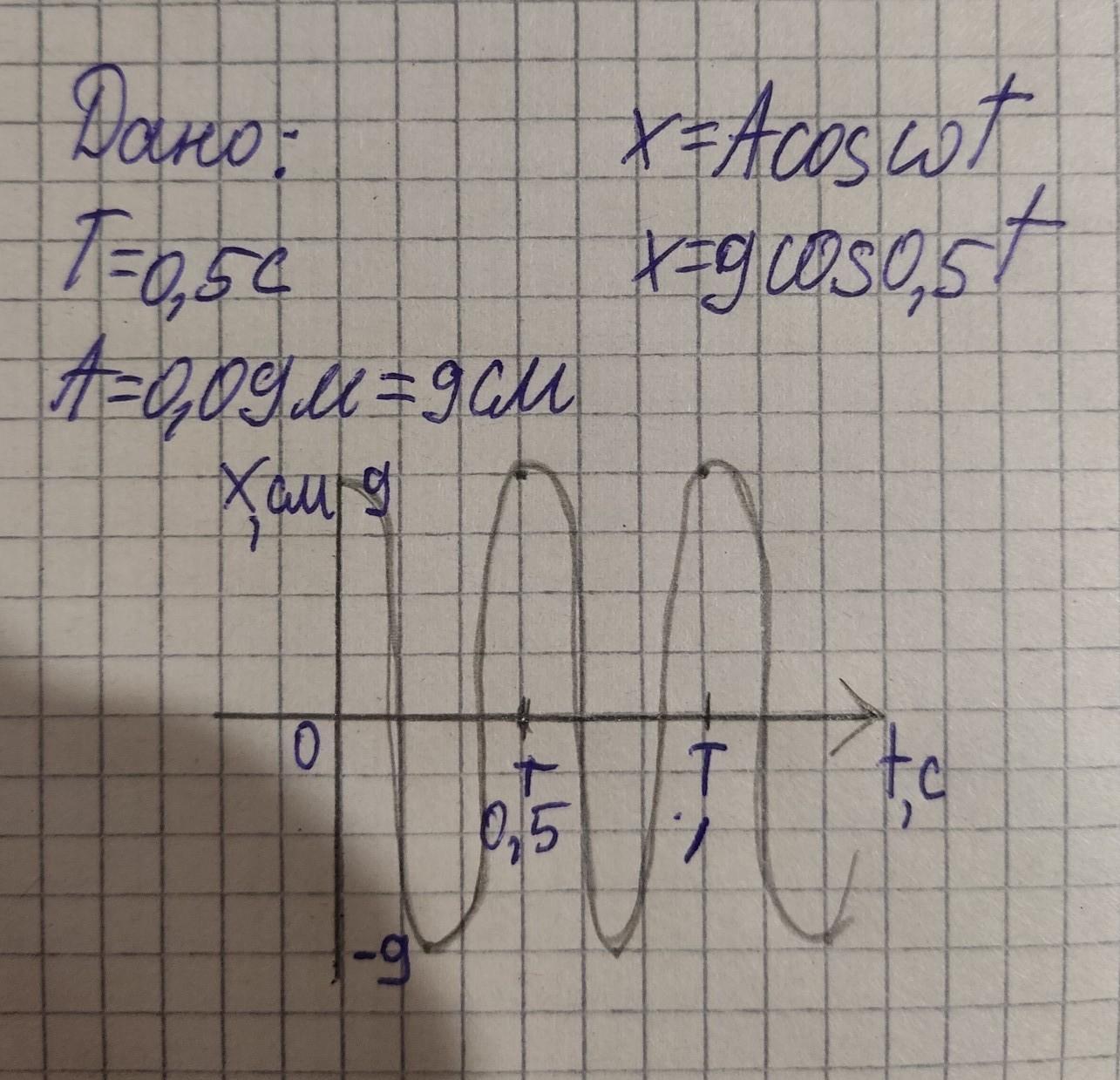 Тіло здійснює гармонічні коливання з періодом 0,5 с. Амплітуда коливання Хм = 0,9 м. Написати рівняння руху тіла за законом косинуса Побудувати графік залежності х (t) до задачі