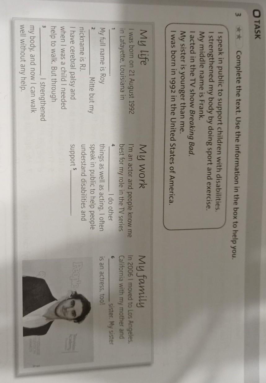 3 6 ★★ Complete the text. Use the information in the box to help you. I speak in public to support children with disabilities. I strengthened my body by doing sport and exercise. My middle name is Frank. I acted in the TV show Breaking Bad. My sister is younger than me. I was born in 1992 in the United States of America. My life I was born on 21 August 1992 in Lafayette, Louisiana in 1 My full name is Roy 2 Mitte but my nickname is RJ. I have cerebral palsy and when I was a child I needed help to walk. But through 3 _, I strengthened my body, and now I can walk well without any help. My work I'm an actor and people know me best for my role in the TV series I do other 4 things as well as acting. I often speak in public to help people understand disabilities and support 5 Myf In 2006 Californ 6 is an a Pe СРОЧНО ПОЖАЛУЙСТА ДАЮ 20 БАЛЛОВ