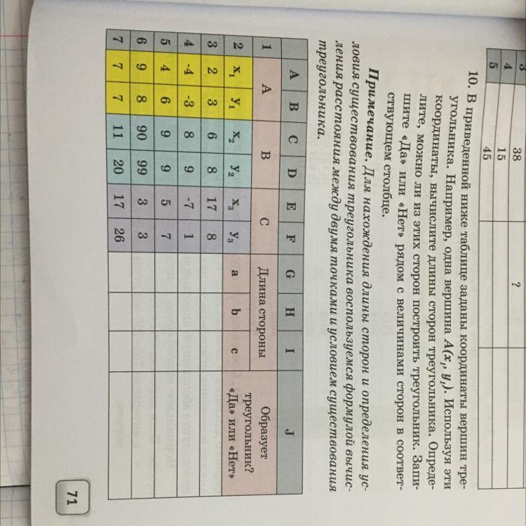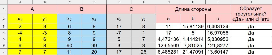 в приведённой ниже таблице заданы координаты вершин треугольника. Например одна Вершина А(x1, y1) используя эти координаты вычислите данные сторон треугольника определите можно ли из этих сторон построить треугольник. Запишите да или нет рядом с величинами сторон в соответствующем столбце