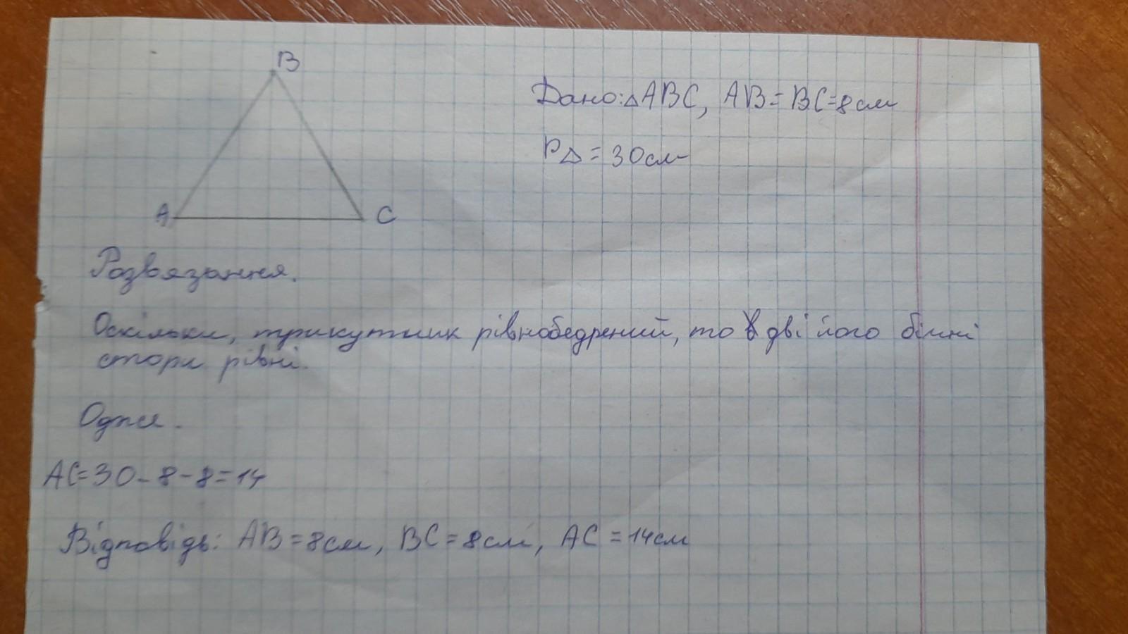 Периметр равнобедренного треугольника равен 30 см найдите длину каждой стороны если один из них 8 см.