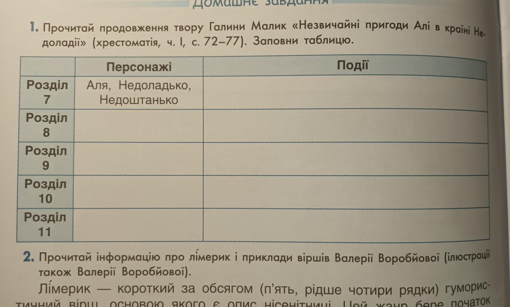 1. Прочитай продовження твору Галини Малик «Незвичайні пригоди Алі в країні Не- доладiї» (хрестоматія, ч. 1, с. 72–77). Заповни таблицю. Події Персонажі Розділ Аля, Недоладько, 7 Недоштанько Розділ 8 Роздiл 9 Розділ 10 Розділ 11.хееелп