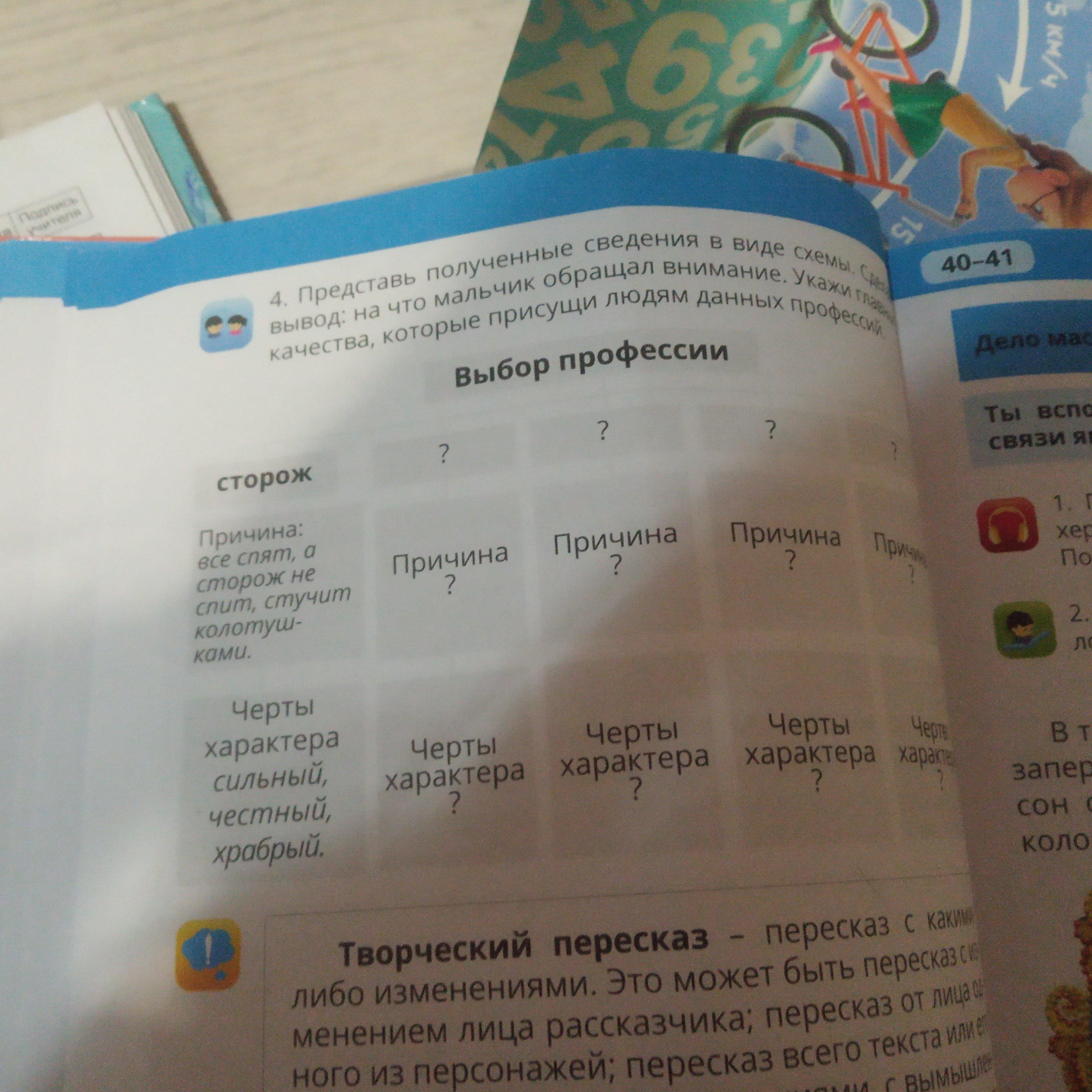 4. Представь полученные сведения в виде схемы. Сделай Вывод: на что мальчик обращал внимание. Укажи главные качества, которые присущи людям данных профессий. Выбор профессии сторож 2 ? ? ? Причина: все спят, а сторож не cnum, стучит колотуш- Ками. Причина причина 7 ? Причина ? Причина ? Черты характера сильный, честный, храбрый. Черты Черты Черты Черты характера характера характера характера ? ? ? Даю 40 БАЛЛОВ