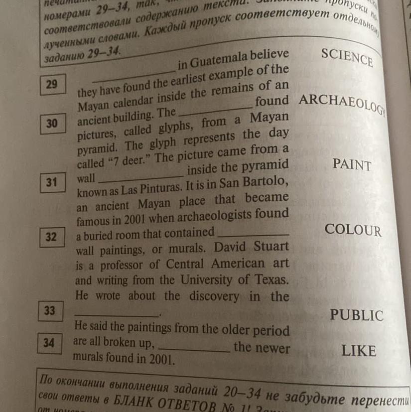 29-34, так, чтобы они грамматически соответствовали содержанию текста. Заполните пропуски полученными словами. Каждый пропуск соответствует отдельному заданию 29-34.