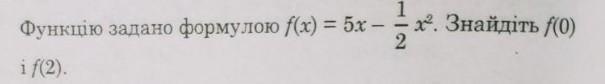 Завдання: Функцію задано формулою f(x)=5x-1/2х². Знайдіть f(0) i f(2).