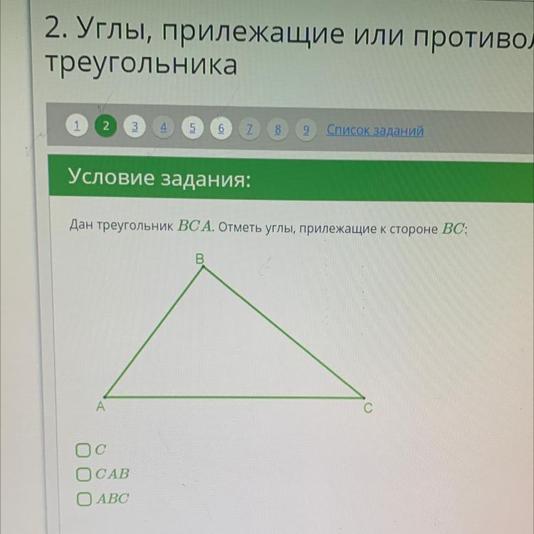 Дан треугольник ВСА. Отметь углы, прилежащие к стороне ВС: