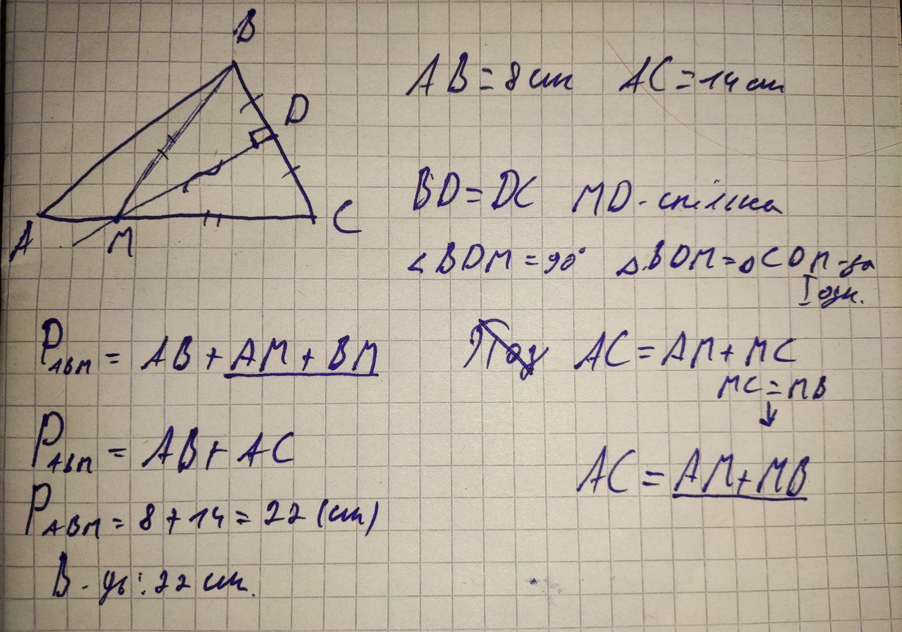 середній перпендикуляр сторони ВС перетинає сторону АС в точці М. знайдіть периметр трикутника АМВ якщо АВ - 8, АС -14