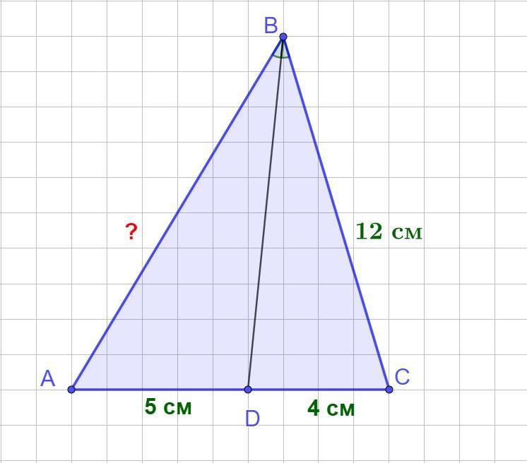 Дано: ΔАВС, BD- бісектриса, AD=5см, CD=4см, ВС=12см,