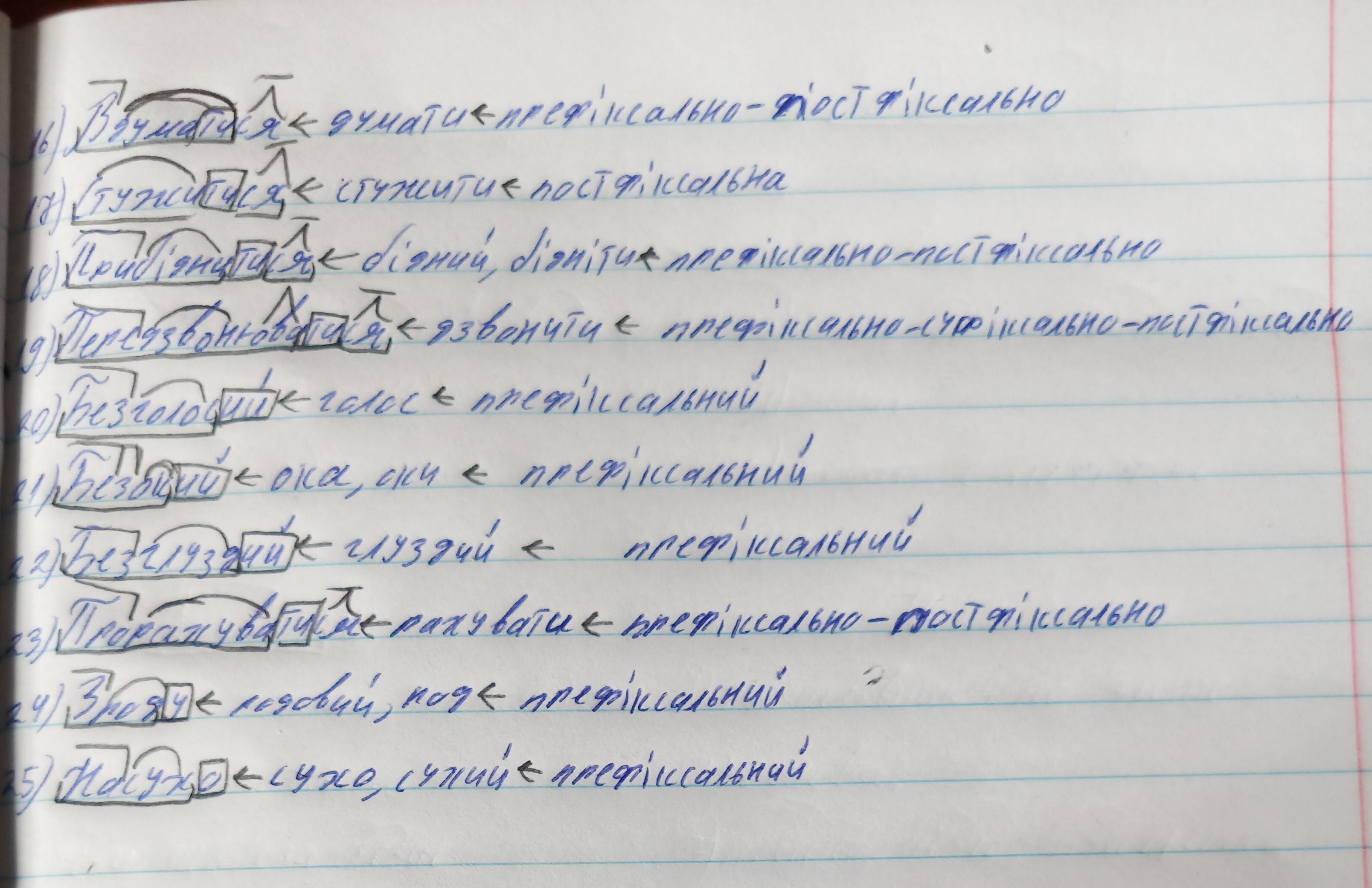 Подружитися, закам’янілість, безвідповідальний, безнаціональний, по -доброму, невільник, надземний, перешийок, співвітчизник, черезплічник, міжряддя, виносячи, по - геройському, абсурдизуватися, союзитися, вдуматися, стужитися, прибіднитися, передзвонюватися, безголосий, безокий, безглуздий, прорахуватися, зроду, насухо.