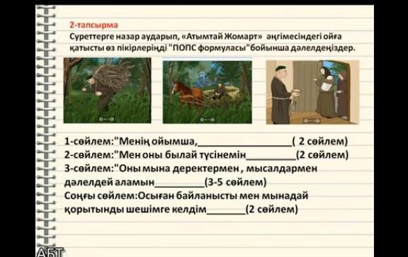 2-тапсырма Суреттерге назар аударып, «Атымтай Жомарт» әңгiмесiндегi ойға қатысты өз пiкiрлерiндi "ПОПС формуласы"бойынша дәлелдеңіздер. 1-сөйлем:"Менің ойымша, 2-сөйлем:"Мен оны былай түсінемін_ 3-сейлем:"Оны мына деректермен, мысалдармен дәлелдей аламын ( Соңғы сейлем:Осыған байланысты мен мынадай қорытынды шешімге келдім