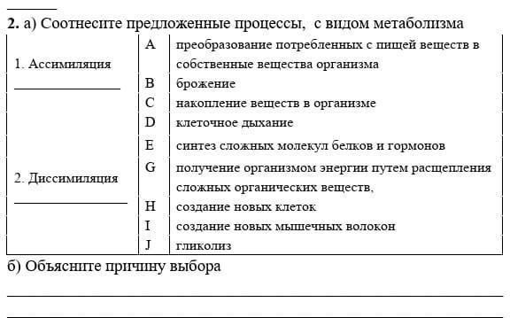 2. а) Соотнесите предложенные процессы, с видом метаболизма преобразование потребленных с пищей веществ в собственные вещества организма брожение накопление веществ в организме клеточное дыхание синтез сложных молекул белков и гормонов получение организмом энергии путем расщепления сложных органических веществ, создание новых клеток создание новых мышечных волокон J ГЛИКОЛИЗ б) Объясните причину выбора 1. Ассимиляция 2. ДИССИМИЛЯЦИЯ B с D E G Н I