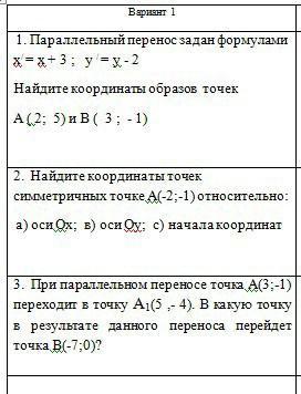 1. Параллельный перенос задан формулами x=x+3; y=x-2 Найдите координаты образов точек A (2; 5) HB ( 3; -1)