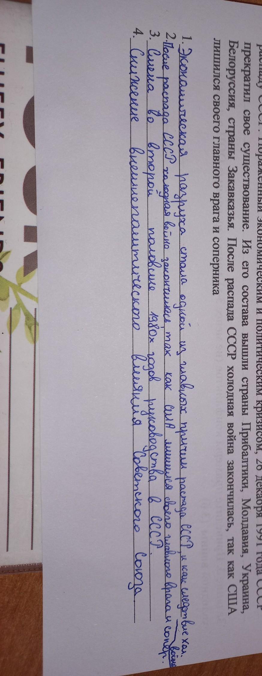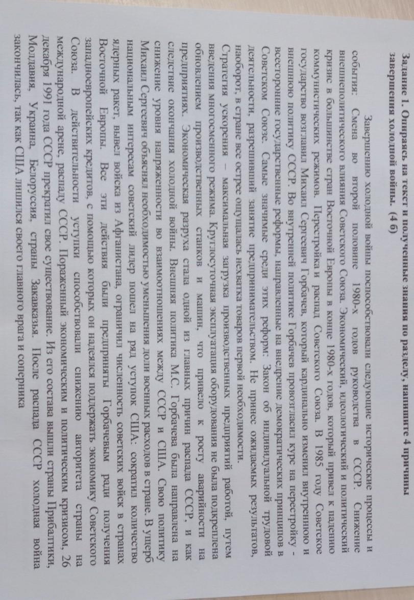 Задание 1. Опираясь на текст и полученные знания по разделу, напишите 4 причины завершення холодной войны. (46) Критерии оценивания Завершению холодной войны поспособствовали следующие исторические процессы и события: Смена BO второй половине 1980-х годов руководства B СССР. Снижение внешнеполитического влияния Советского Союза. Экономический, идеологический и политический кризис в большинстве стран Восточной Европы в конце 1980-х годов, который привел к падению коммунистических режимов. Перестройка и распад Советского Союза. В 1985 году Советское государство возглавил Михаил Сергеевич Горбачев, который кардинально изменил внутреннюю и внешнюю политику СССР. Во внутренней политике Горбачев провозгласил курс на перестройку - всесторонние государственные реформы, направленные на внедрение демократических принципов в Советском Союзе. Самые значимые среди этих реформ: Закон об индивидуальной трудовой деятельности, разрешивший занятие предпринимательством. Не принес ожидаемых результатов, наоборот, в стране все острее ощущалась