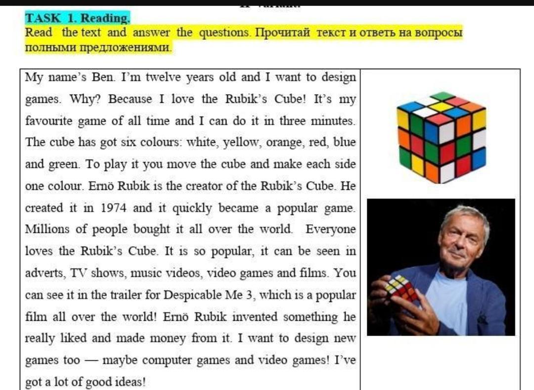 sentences. 4 *** Answer the questions. Write complete es, for games. Who invented the Rubik's Cube? Ernö Rubik invented the Rubik's Cube. 2 What colours are in the cube? 1 How many people bought the Rubik's Cubel 3 When did Rubik first make the cube? 4 How do you play the Rubik's cube? successful? 5 How do we know the Rubik's cube is 6 What does Ben want to do in the future?