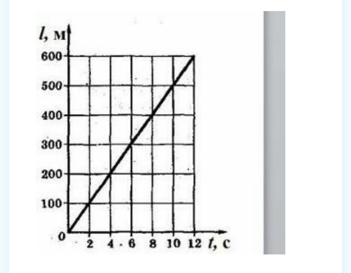 Возьмём любую точку. Например 2 с. Поднимаемся вверх до графика и потом влево до оси. Там точка 100 м. Значит за 2 с тело прошло 100 м. Тогда скорость V=S/t=100/2=50 м/с. Это ответ. Можно взять другую точку. 12 с и 600 м. Тогда V=600/12=50 м/с.