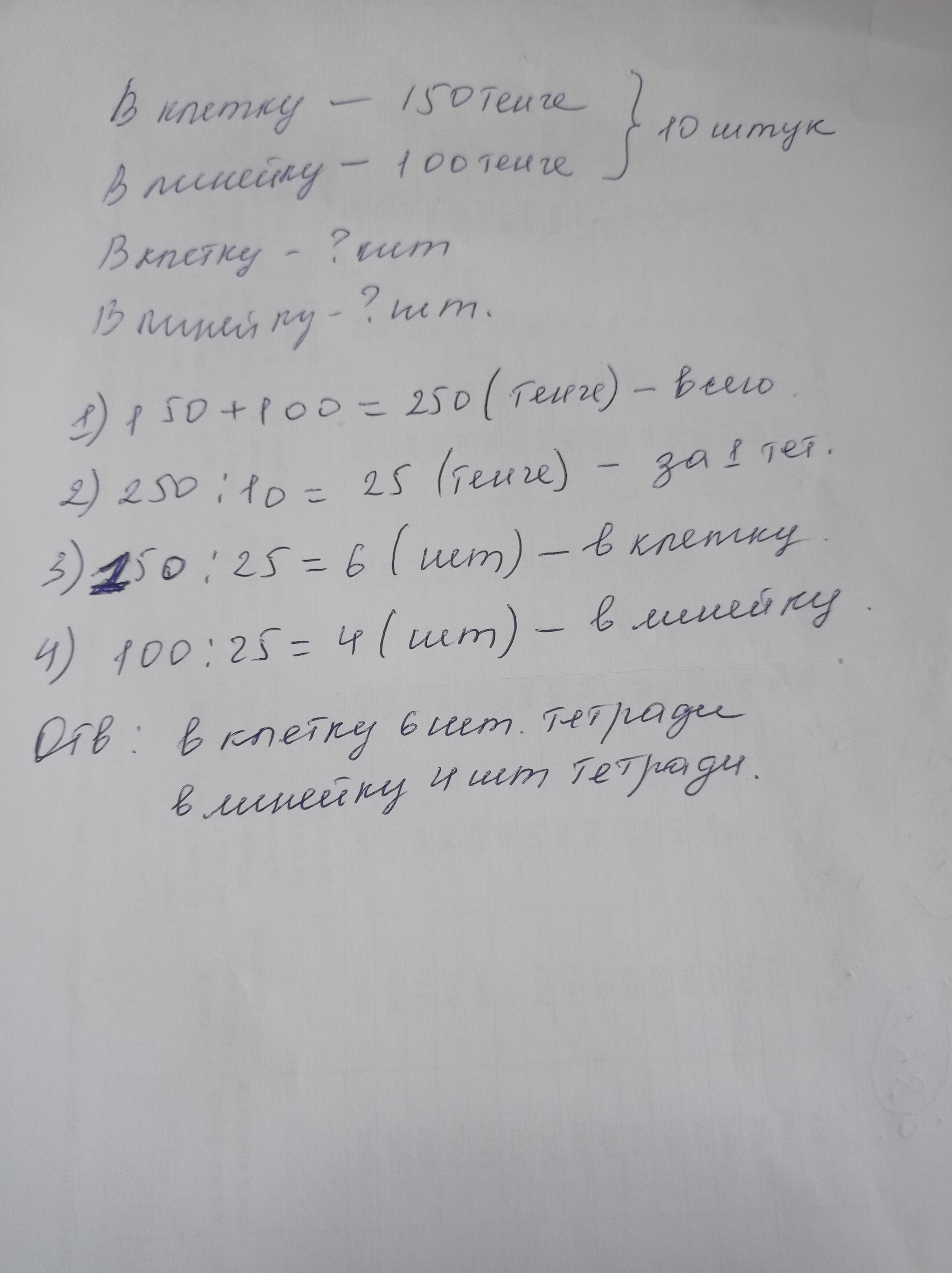 ДОМАШНЕЕ ЗАДАНИЕ 10 Реши задачи. a) Ученица купила тетради в клетку и линейку по одинако- вой цене. Всего - 10 штук. За тетради в клетку она уплатила 150 тенге, а за тетради в линейку - 100 тенге. Сколько было куплено тетрадей в клетку и линейку по отдельности? 6) Запи . решить полностью всю раздачи решить задачу
