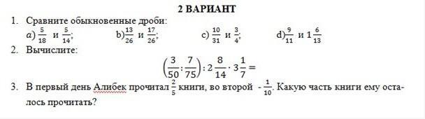 1. Сравните обыкновенные дроби: b) и 17. 26 26 14 2. Вычислите: 2 ВАРИАНТ c) 31 8 (30177):214-37- 50 75. 2 3. В первый день Алибек прочитал - книги, во второй лось прочитать? = 10 d) и 113 Какую часть книги ему оста-