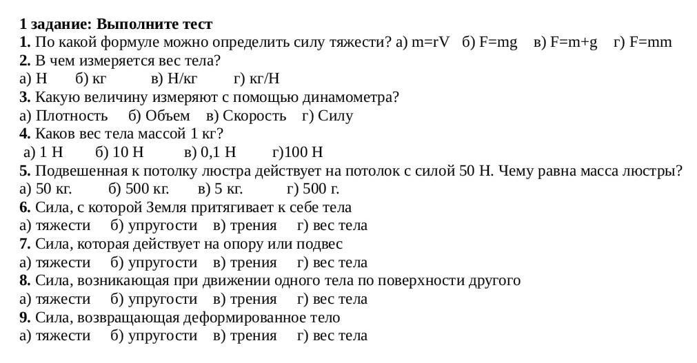 1 задание: Выполните тест 1. По какой формуле можно определить силу тяжести? a) m=rV б) F=mg в) F=m+g r) F=mm 2. В чем измеряется вес тела? a) H б) кг в) Н/кг г) кг/н 3. Какую величину измеряют с помощью динамометра? a) Плотность 4. Каков вес тела массой 1 кг? a) 1 H б) 10 н в) 0,1 н г) 100 н 5. Подвешенная к потолку люстра действует на потолок с силой 50 Н. Чему равна масса люстры? а) 50 кг. в) 5 кг. г) 500 г. б) 500 кг. 6. Сила, с которой Земля притягивает к себе тела a) тяжести б) упругости в) трения г) вес тела б) Обьем в) Скорость г) Силу 7. Сила, которая действует a) тяжести б) упругости в) трения на опору или подвес г) вес тела 8. Сила, возникающая при движении одного тела по поверхности другого a) тяжести б) упругости в) трения г) вес тела 9. Сила, возвращающая деформированное тело a) тяжести б) упругости в) трения г) вес тела СРОЧНО ПОМОГИТЕ