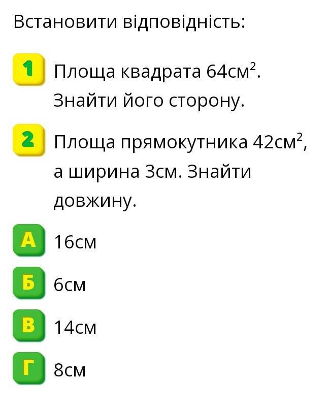 2. для прямоугольника такой же способ только у него разные стороны (S=a*b) одну переменную (ширину мы знаем это 3см) площадь это 42см (из условия) подставляем переменные в формулу 42=a*3 (длинна это a) тогда а=42:3=14 => длинна прямоугольника 14см
