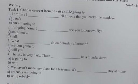 48 БАЛЛОВПомогите пожалуйста, срочно!!! Writing Task 1. Choose correct item of will and be going to. 1. I promise I a) won't b) am not going to 2. I'm going home. I a) am going to b) will 3. What a) are you going to b) will you 4. The sky is very dark. There a) is going to b) will tell anyone that you broke the window. see you tomorrow. Bye! do on Saturday afternoon? be a thunderstorm. Exercise »> Tor 5. We haven't made any plans for Christmas. We a) probably are going to b) will probably