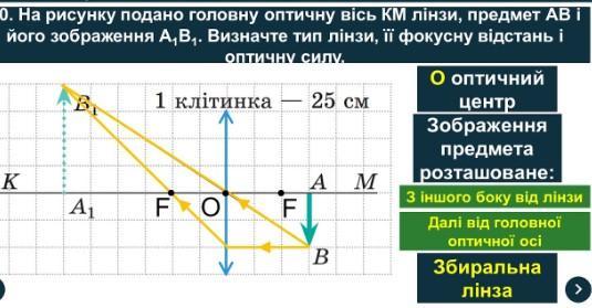 На рисунку подано головну оптичну вісь КМ лінзи, предмет AB і його зображення A1B1. Визначте тип лінзи, її фокусну відстань і оптичну силу