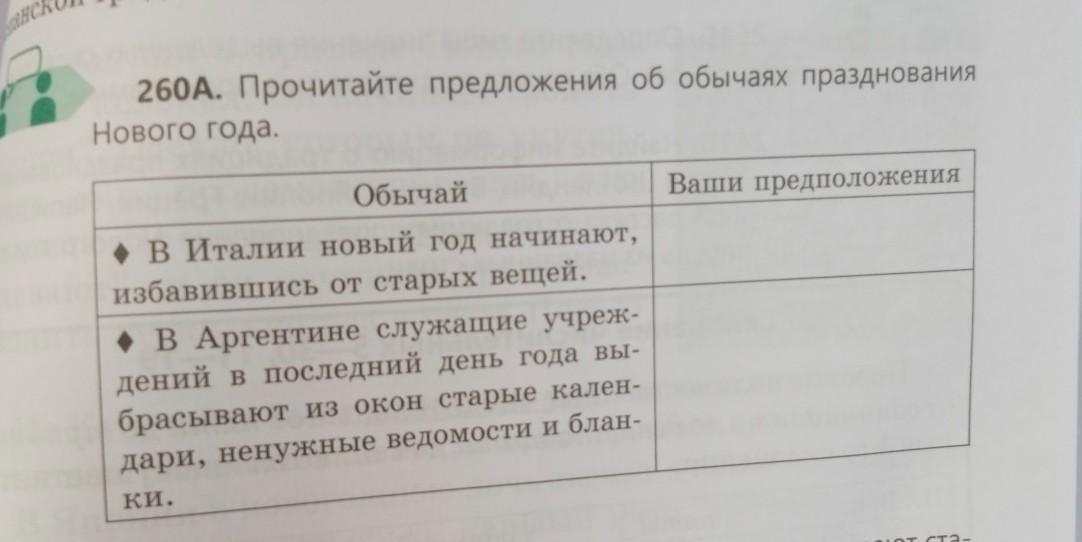 260А. Прочитайте предложения об обычаях празднования Нового года. Обычай В Италии новый год начинают, избавившись от старых вещей. • В Аргентине служащие учреж- дений в последний день года вы- брасывают из окон старые кален- дари, ненужные ведомости и блан- ки. Ваши предположения
