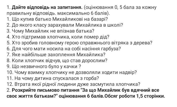 13. За що Михайлик був вдячний все своє життя батькам ? Михайлик все життя був вдячний своїм батькам за те, що вони в нелегкі роки пожертвували єдиним сімейним скарбом - коровою, щоб дати мождивість синові навчатися. Автор каже, що все життя проніс цю вдячність у своїй душі. Він схиляє "...свою, вже посивiлу голову" ".. перед людянiстю, скромнiстю i мудрiстю" своєї матері. Саме матір стояла "мов благання" коло долі Михайлика.