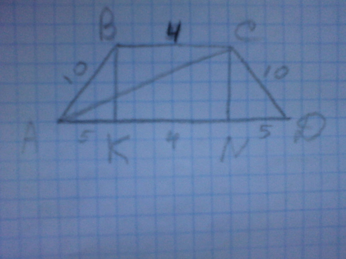 Попробуй понять по рисунку, как мы получили эти длины...ВК и СN - высоты трапеции...т.к. трапеция равнобедренная, то угол D=А=60 градусов...рассмотрим треугольник СND - прямоугольный...из предыдущего предложения следует, что угол NCD=30...против угла в 30 градусов лежит половина гипотенузы, значит, ND=1/2 CD=5...по следствию из теоремы Пифагора найдем CN: CN=