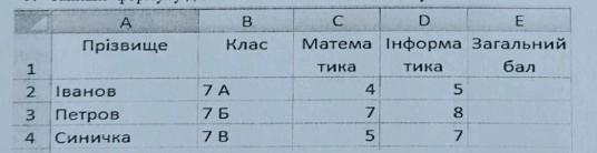 СРОЧНО ДАМ 50 БАЛЛОВ!!!ОЧЕНЬ СРОЧНО!!!!!!Запиши формулу для обчислення загального балу в клітинці Е2і скопіюй її в клітини Е3 і Е4