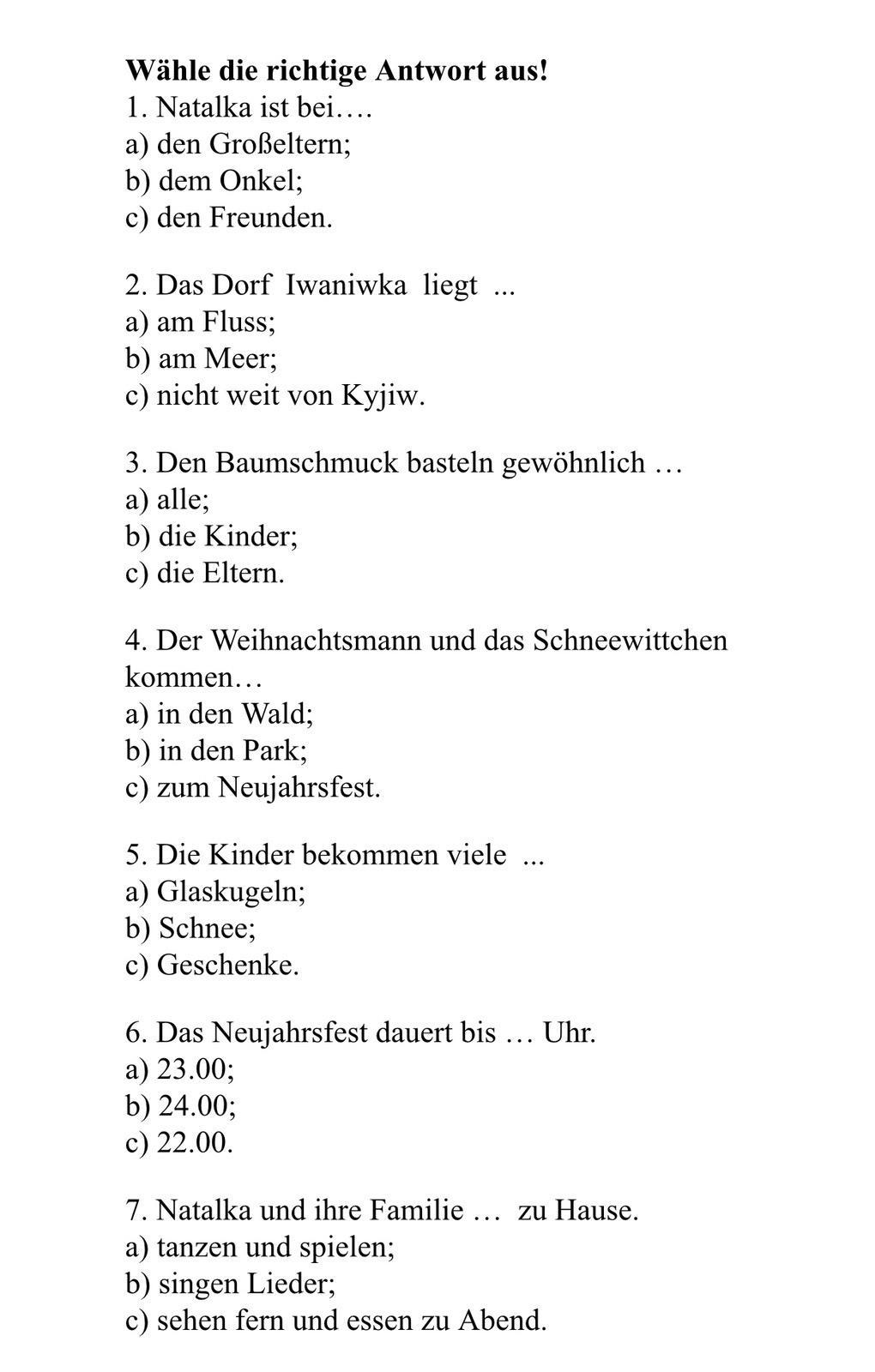 Виберіть правильну відповідь! 1. Наталка на... а) бабусі та дідусі; б) дядько; в) друзі. 2. Село Іванівка розташоване .. а) біля річки; б) біля моря; в) неподалік Києва. 3. Зазвичай роблять прикраси для дерева... а) всі; б) діти; в) батьки. 4. Ідуть Дід Мороз і Снігуронька... а) у лісі; б) до парку; в) для святкування Нового року. 5. Діти отримують багато ... а) скляні кульки; б) сніг; в) подарунки. 6. Новорічне свято триває до ... год. а) 23.00; б) 24.00; в) 22.00. 7. Наталка з родиною... вдома. а) танцювати і грати; б) співати пісні; в) дивитися телевізор і вечеряти