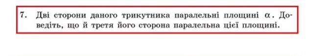 Ми можемо провести в площині а 2 прямі, паралельні даним, отже, площина, в якій лежить трикутник, паралельна пл. а. То, так как як третя сторона належить площині трикутника, то за (якоюсь там ознакою чи властивістю): будь яка пряма, що лежить на площині, паралельній даній, паралельна цій даній площині. Отже, сторона паралельна площині а, що і треба було довести
