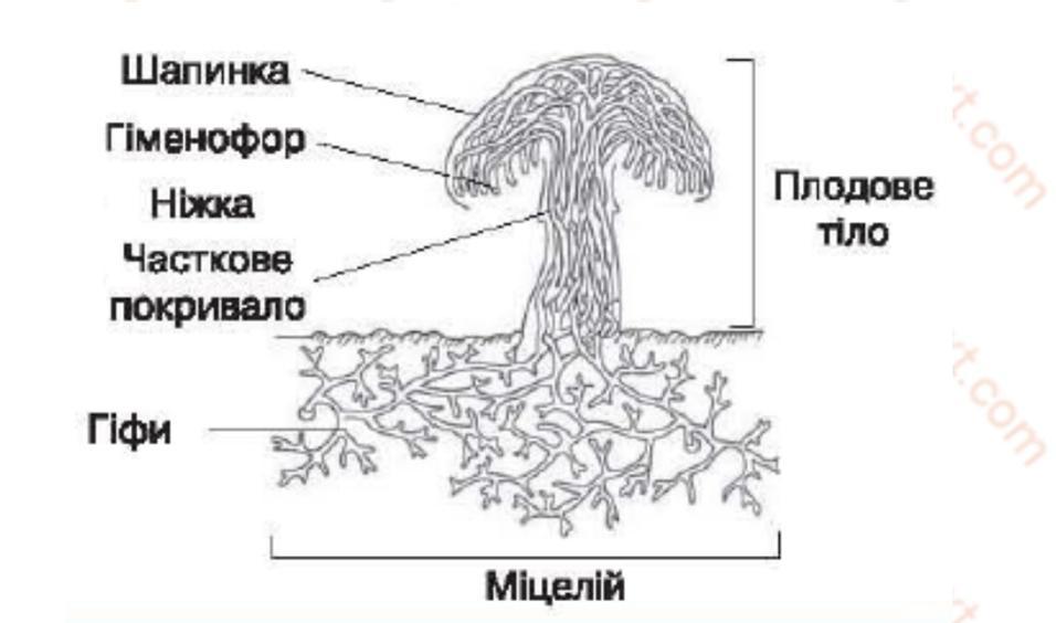12. Складова частина гриба, представлено щільно переплетоними гіфами міцелію: A плодове тіло: Б Міцелій; В корінь, Г шапинка.