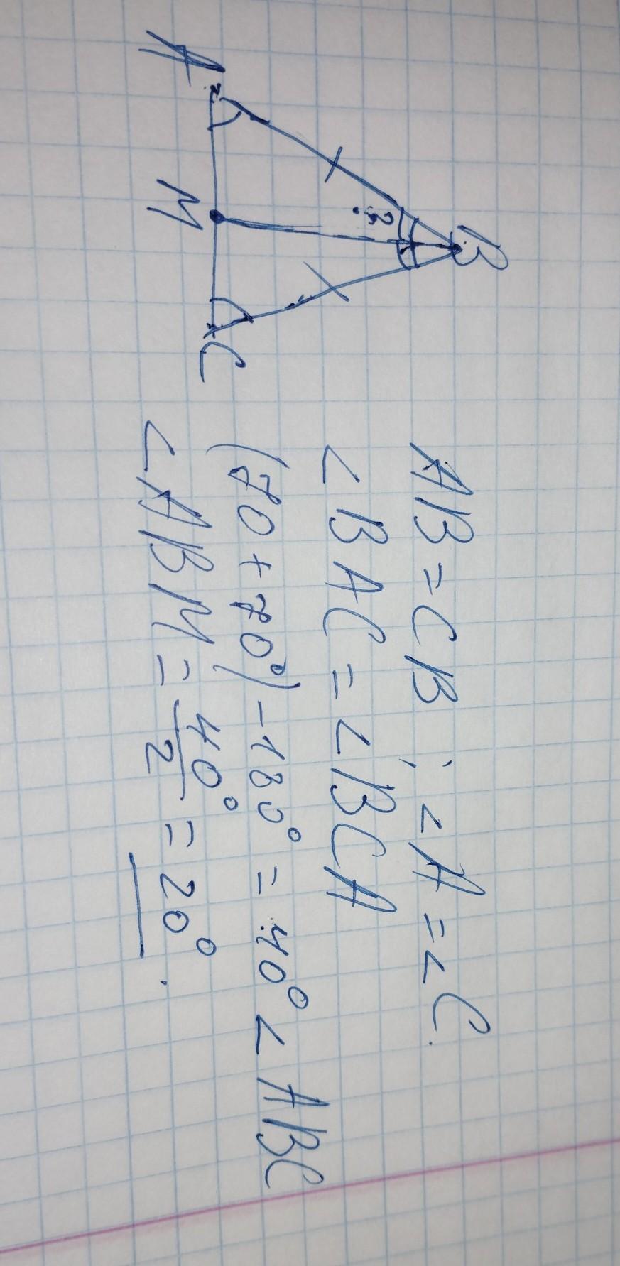 У ΔАВС АВ = СВ , ∠А = ∠С . Точка М - середина сторони АС . Знайдіть ∠АВМ, якщо ∠ВAC = 70 градусів.