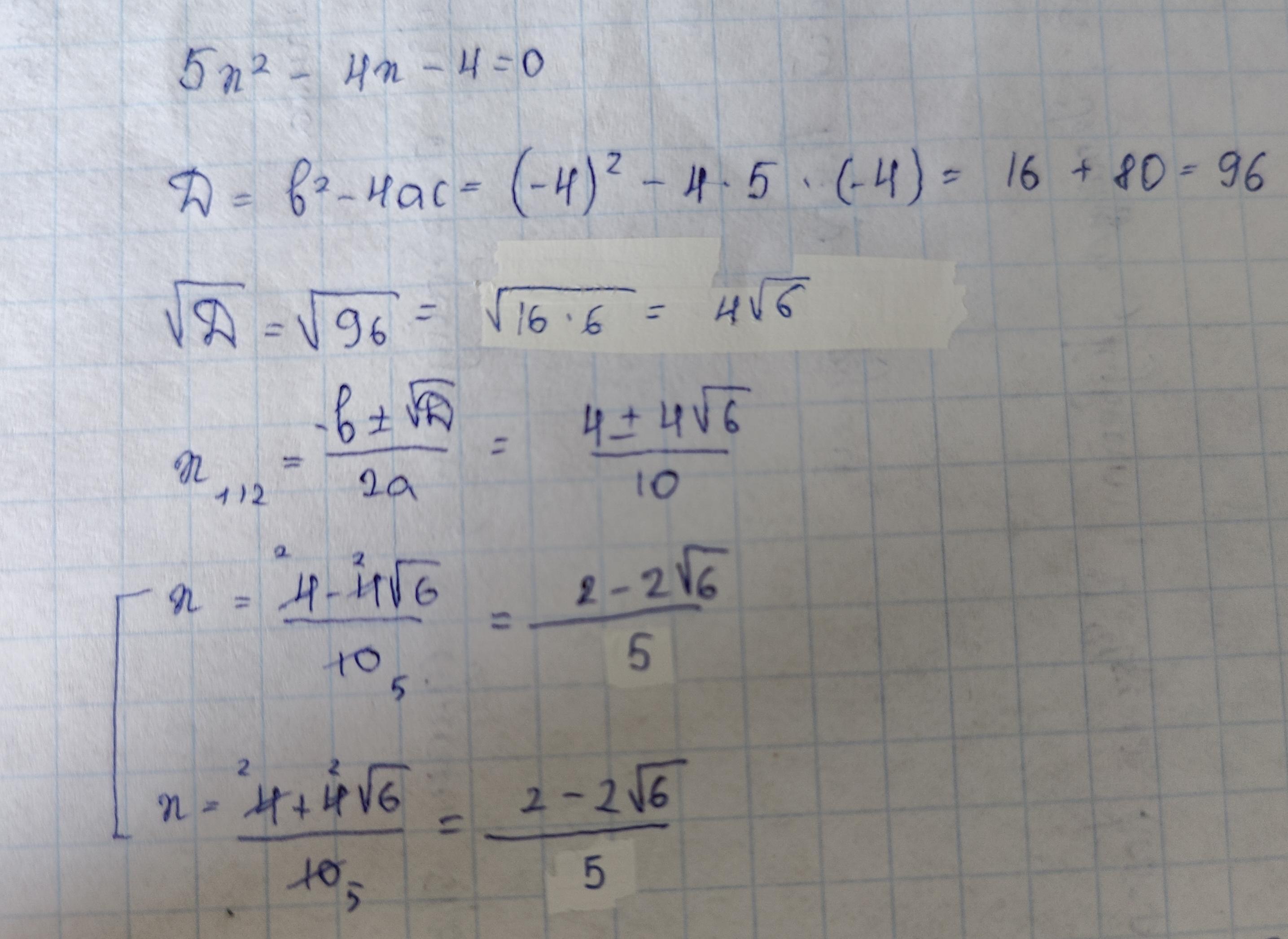 х2 = (4+√96)/(2*5) = (4+√96)/10 = (4+4√6)/10 =