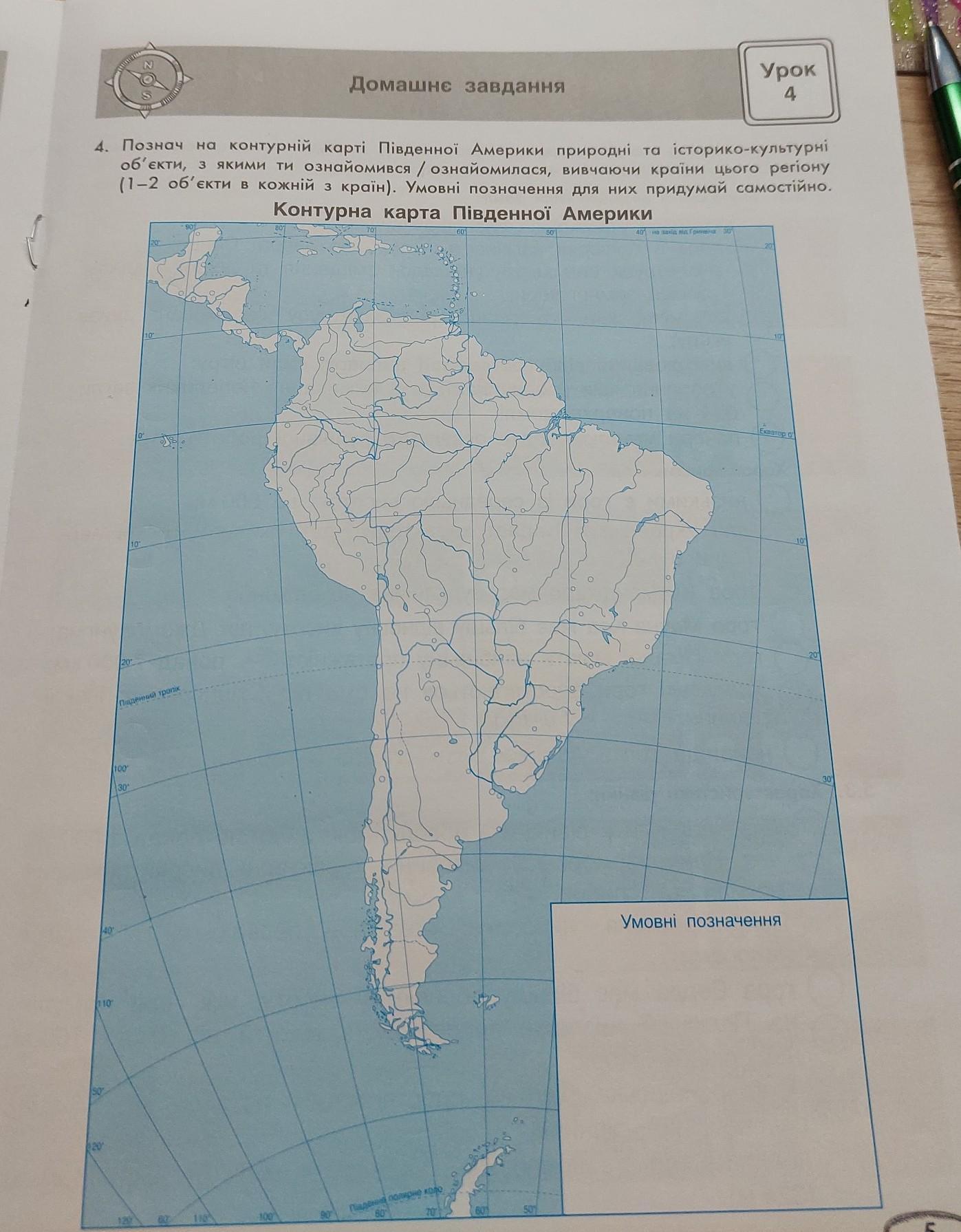 4. Познач на контурній карті Південної Америки природні та історико-культурні об'єкти, з якими ти ознайомився / ознайомилася, вивчаючи країни цього регіону (1-2 об'єкти в кожній з країн). Умовні позначення для них придумай самостійно. Америки.