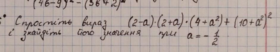 \displaystyle\bf\\\underbrace{(2-a)(2+a)}_{2^{2} -a^{2}}\cdot(4+a^{2} )+(10+a^{2} )^{2} = \underbrace{(4-a^{2})\cdot (4+a^{2} )}_{4^{2} -(a^{2})^{2}}  +(10+a^{2} )^{2} = \\\\=16-a^{4} +100+20a^{2} +a^{4} =20a^{2} +116\\\\a=-\frac{1}{2} \\\\\\20a^{2}+116=20\cdot\Big(-\frac{1}{2} \Big)^{2} +116=20\cdot \frac{1}{4} +116=5+116=121